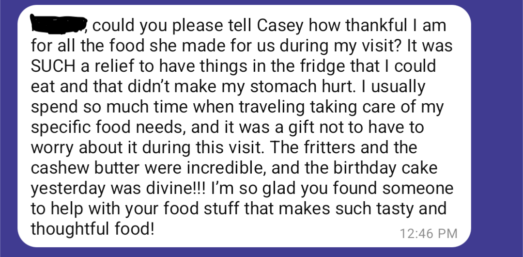 I am so grateful to Casey for her thoughtful, beautifully prepared, nourishing and healing foods! She has cooked yummy recipes to feed the omnivores, vegans, gluten-free, and Whole 30-loving eaters in my family, and is so easy to communicate with about preferences, needs, and food quirks. Some of our favorites have been vegan/gf lasagna, chicken stir-fry, and coconut-date energy bites!